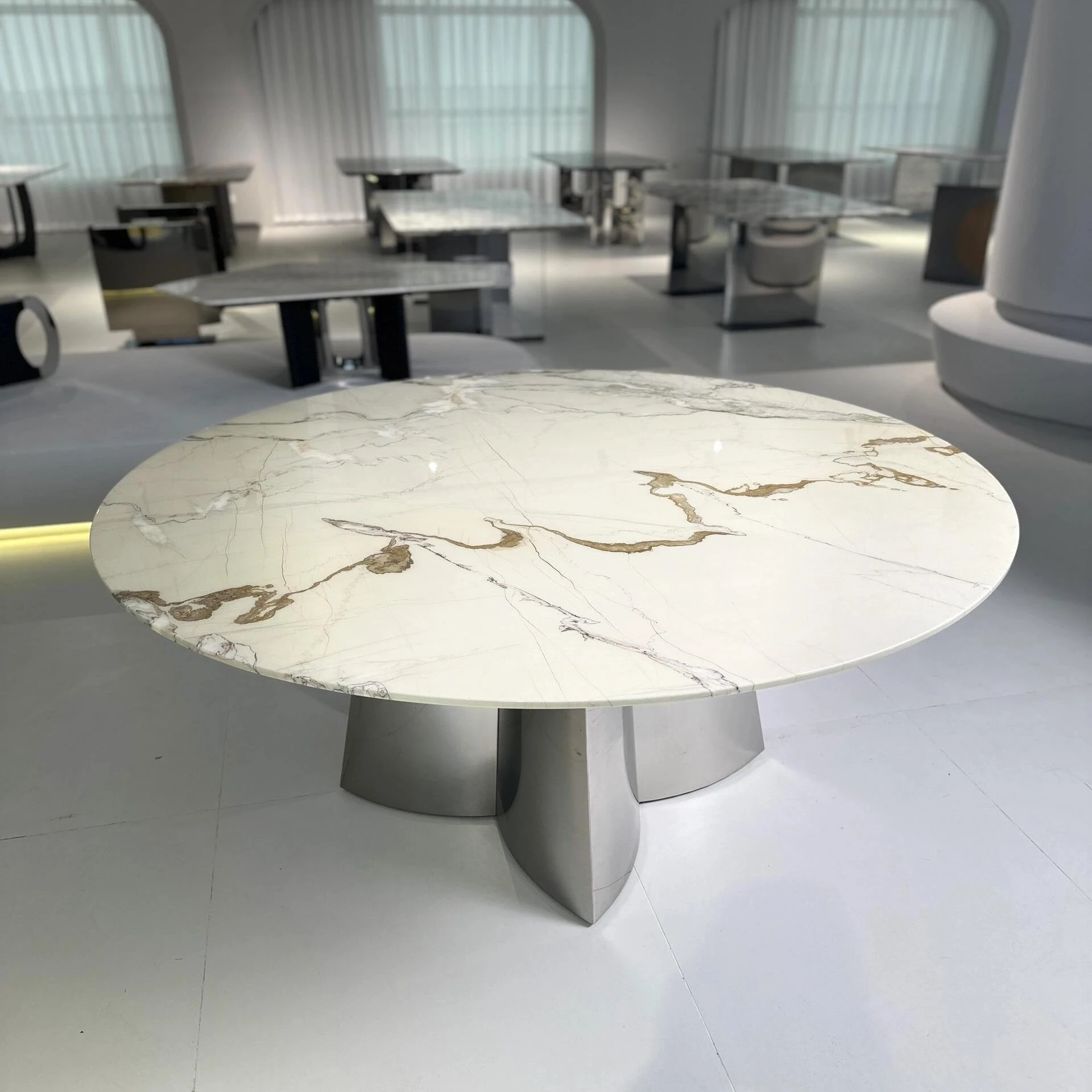 天然大理石製ラウンドダイニングテーブル - 高級ホテルや豪華マンションに最適!モダンなリビングルームにぴったりの洗練されたデザインで、上質なひとときを提供します。高級感溢れる空間を演出する、エレガントなアイテムです。