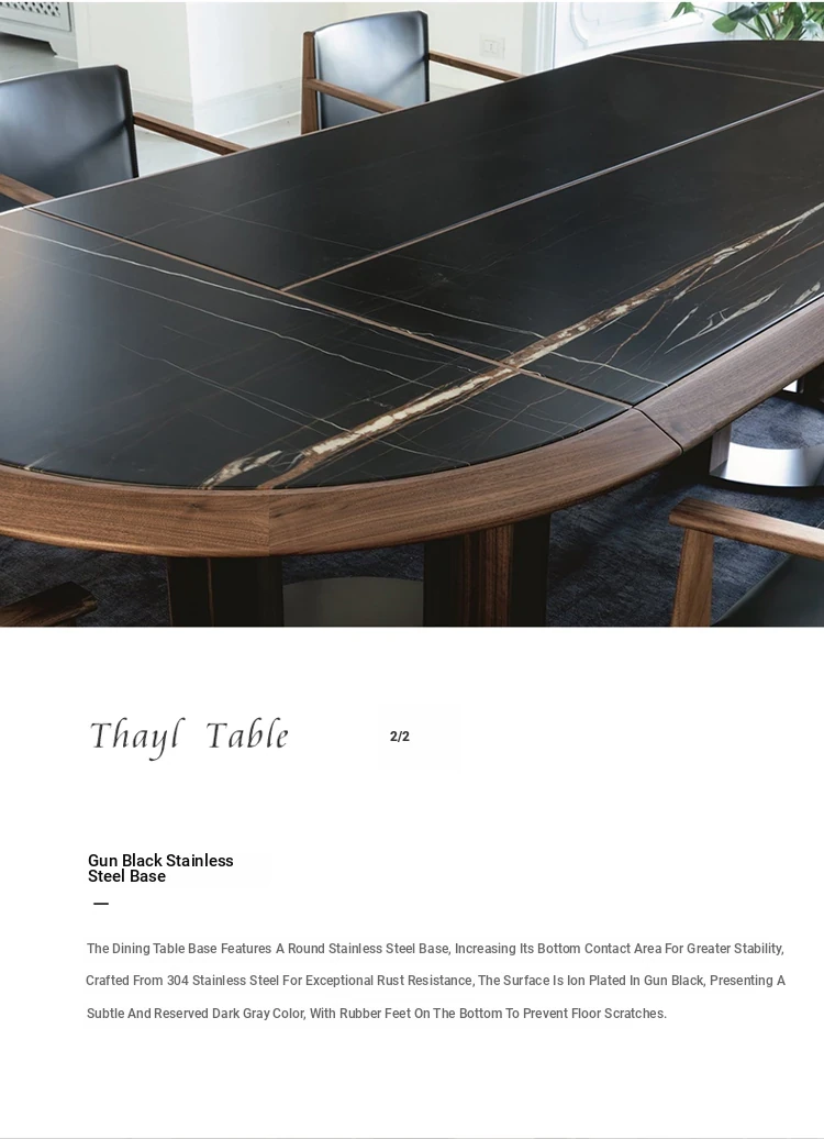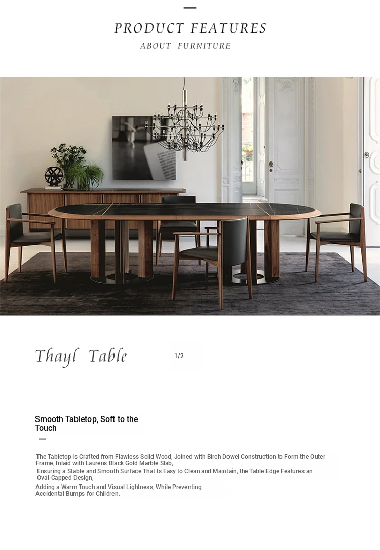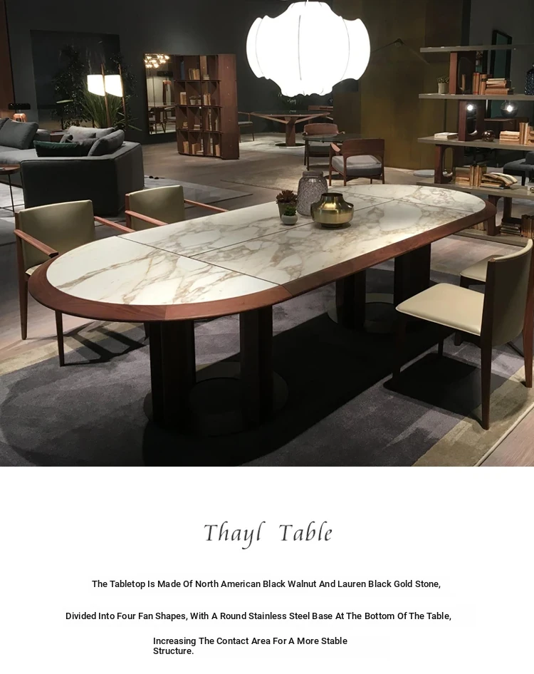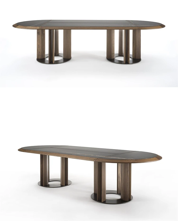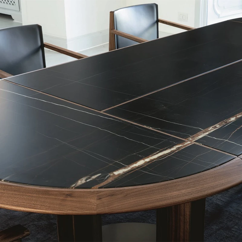 Elegant Italian Black Walnut Marble Dining Table Set - Large Solid Wood Oval Dining Table and Chairs for Villas