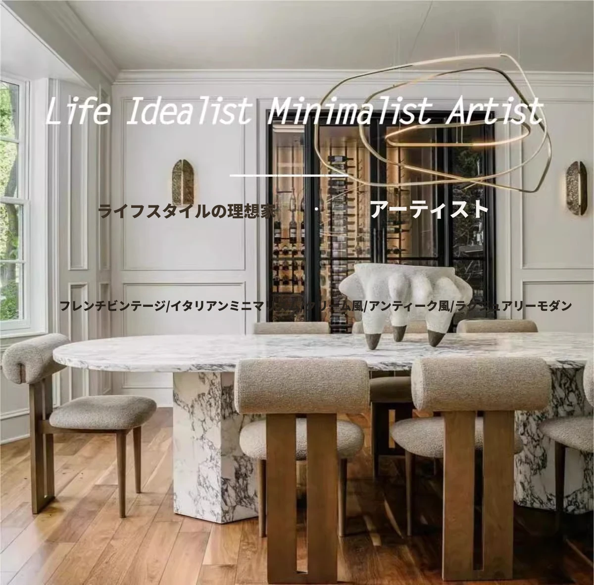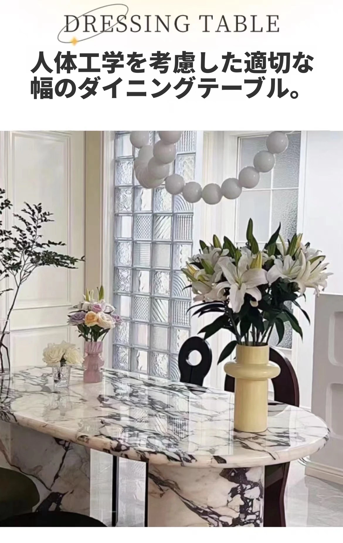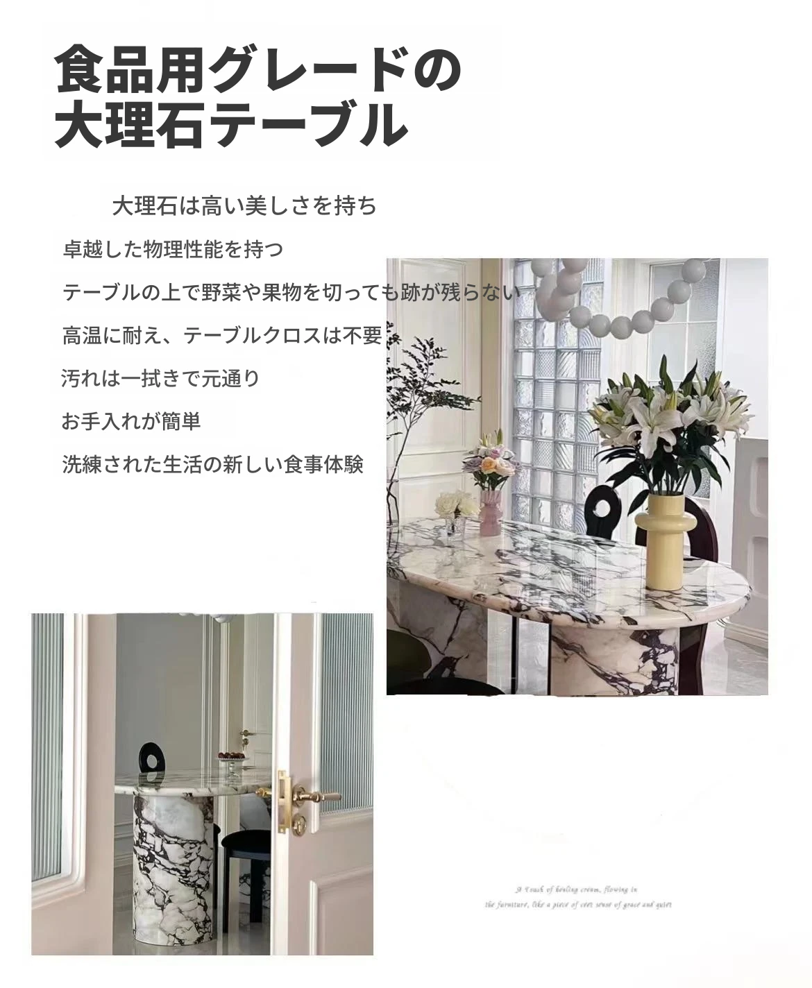フランス風カラカタ紫大理石ダイニングテーブル|レトロINSスタイルのエレガントなオーバルデザイン|高級ヴィラ向けの中古クリーム色テーブルで、洗練された空間を演出!