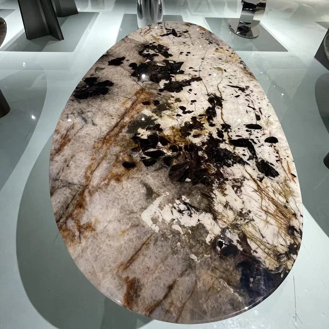 高級感あふれる天然大理石製の長方形ダイニングテーブル - リゾートホテル風のインテリアに最適!モダンで洗練されたデザイン、広々とした空間にぴったりのラグジュアリーなアイテム。