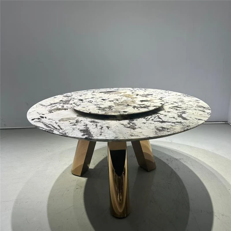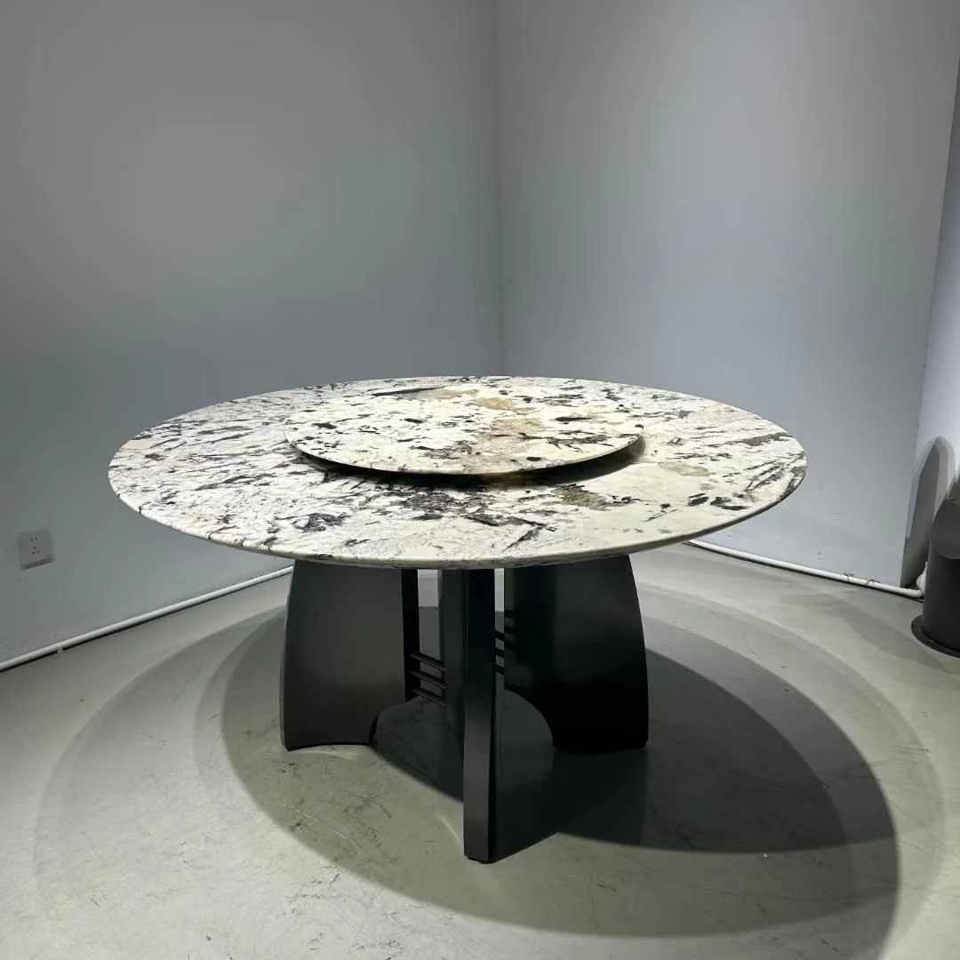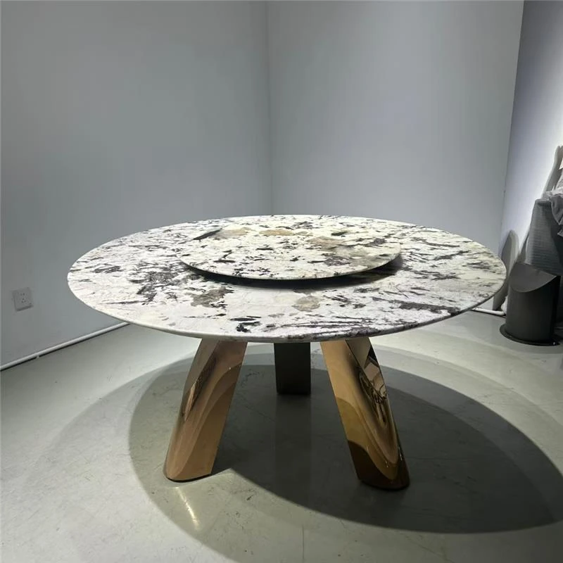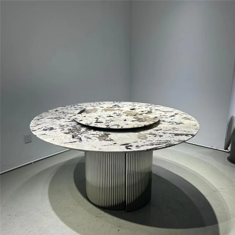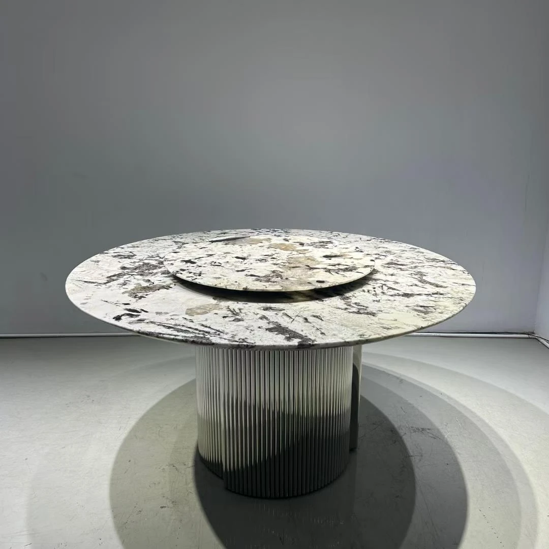 高級感溢れる天然大理石製のラウンドダイニングテーブル - イタリアンスタイルの贅沢な家用テーブル、回転式プレート付きで広々とした別荘や大サイズのリビングに最適!
