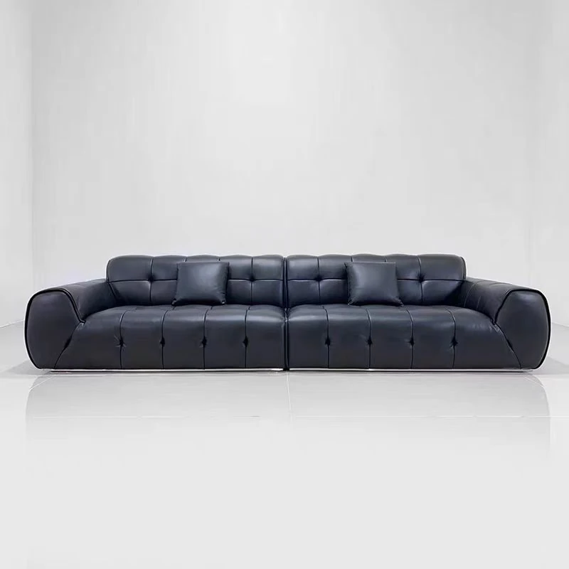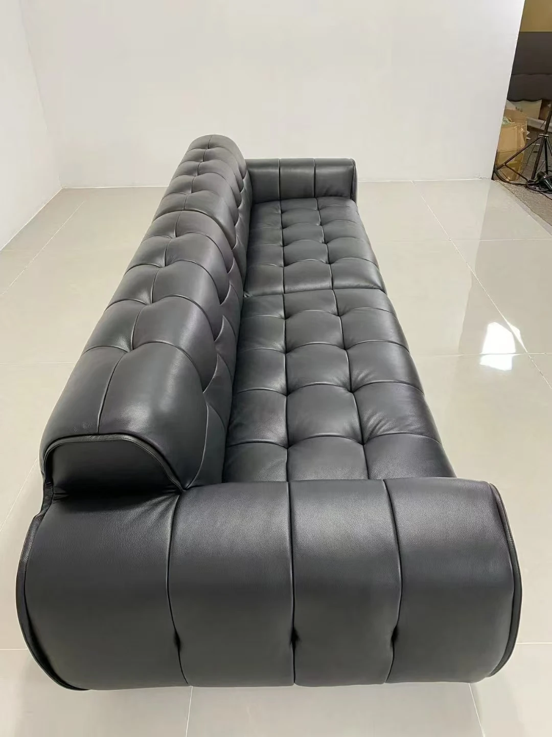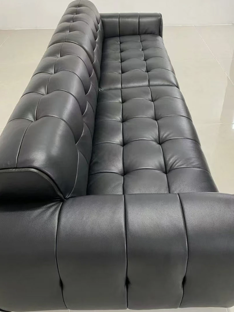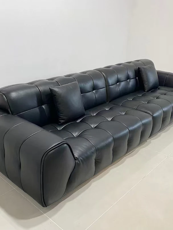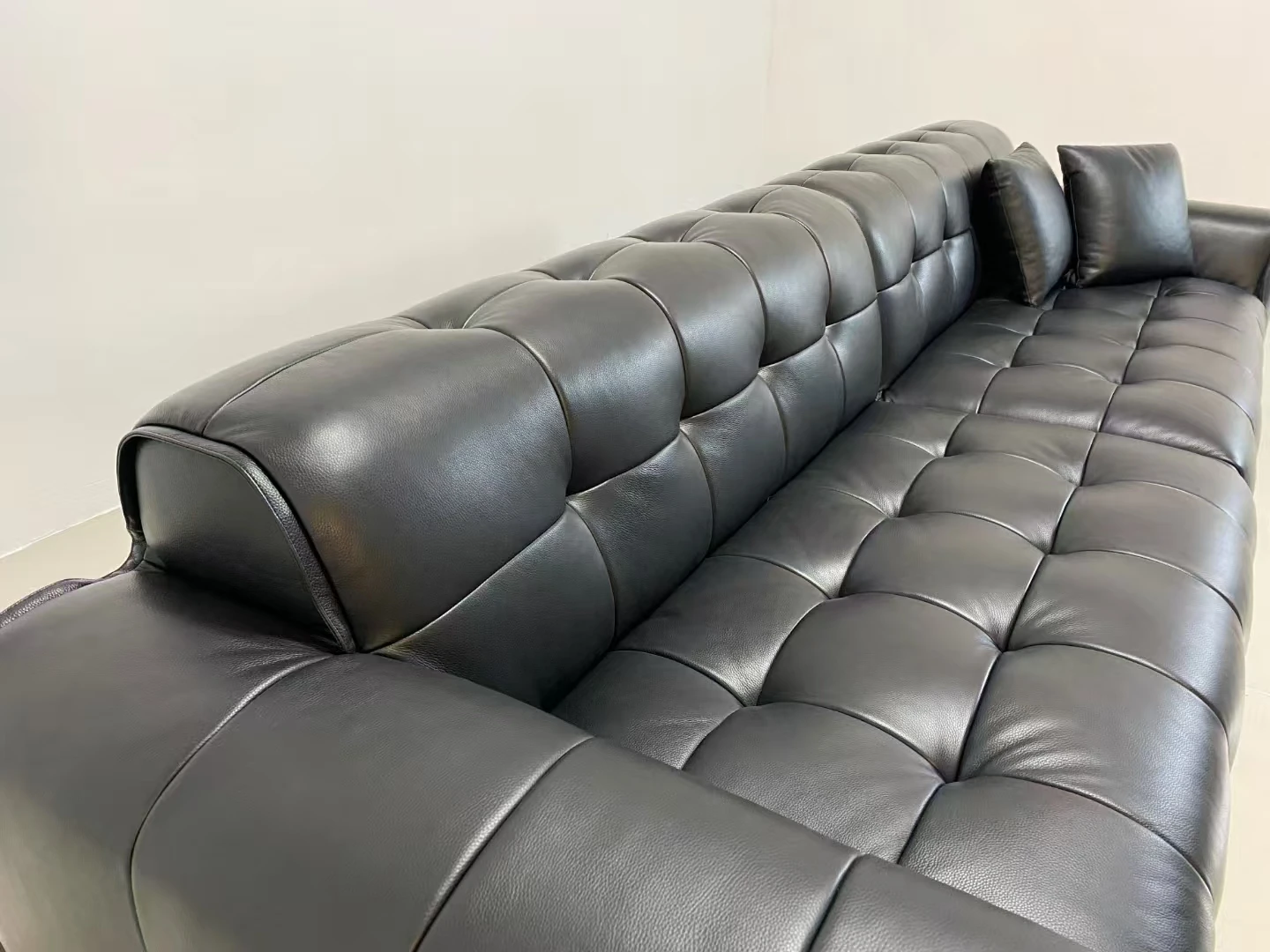 モダンミニマリスト・ブラックレザーソファ|デザイナーによる高級本革直線デザイン|中厚の上質な牛革使用|スタイリッシュで耐久性抜群のリビングに最適な一品!
