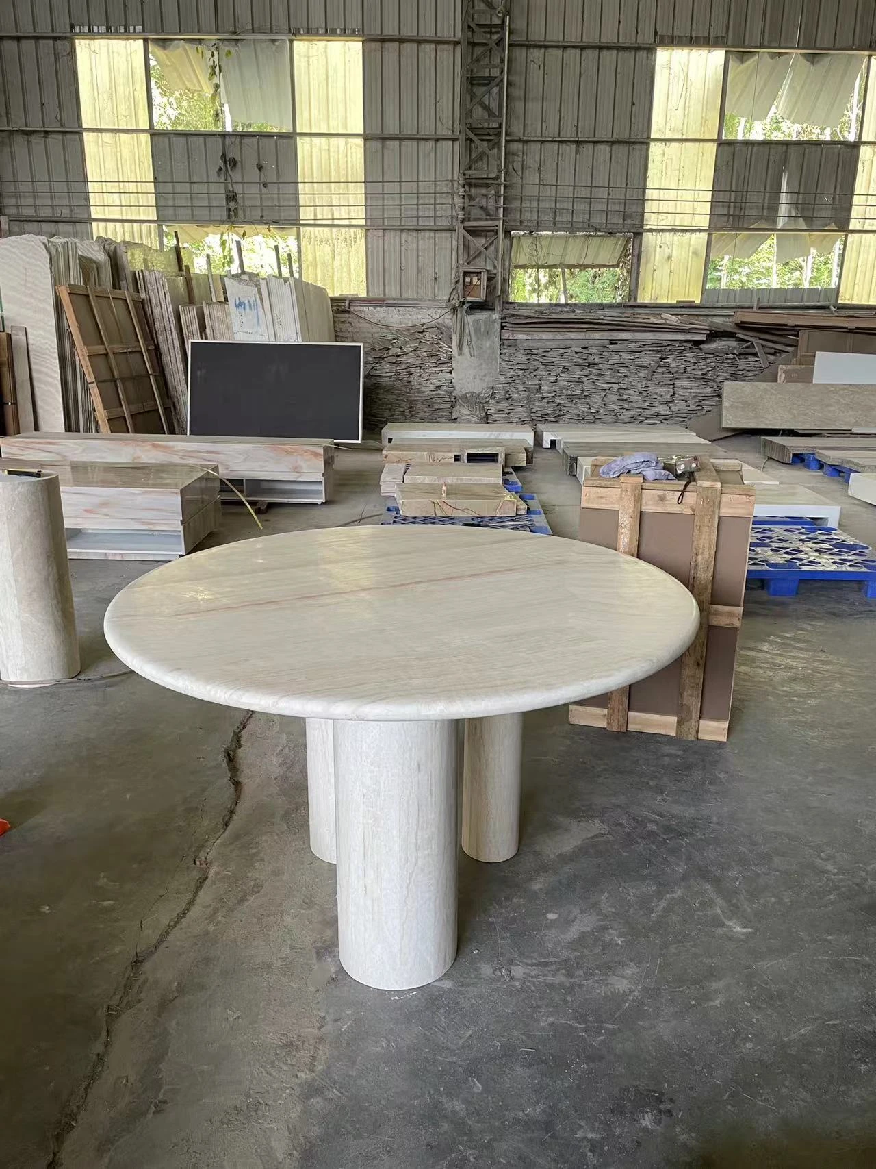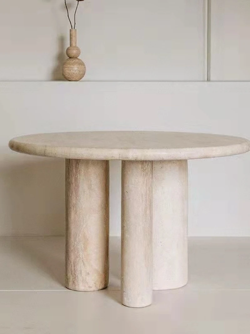 北欧シンプルでおしゃれなイエロー洞石の円形テーブル|デザイナーのモデルルームにぴったり!創造的な大理石の小型ダイニングテーブルで、スタイリッシュな空間を演出します。